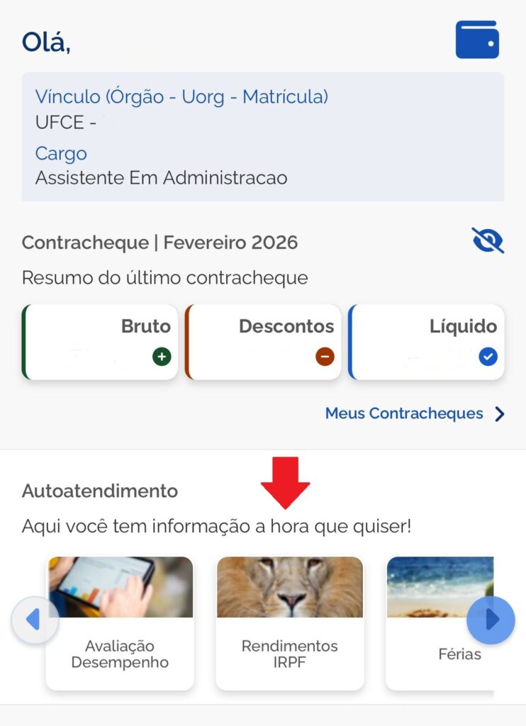 Os comprovantes de rendimentos do ano-base 2025 dos servidores ativos e aposentados, ex-servidores e pensionistas já estão disponíveis na plataforma SouGov.br, seja na versão web ou aplicativo para smartphone. Ao acessar a tela inicial do aplicativo, basta procurar a sessão “Autoatendimento”= e selecionar “Rendimentos IRPF”.